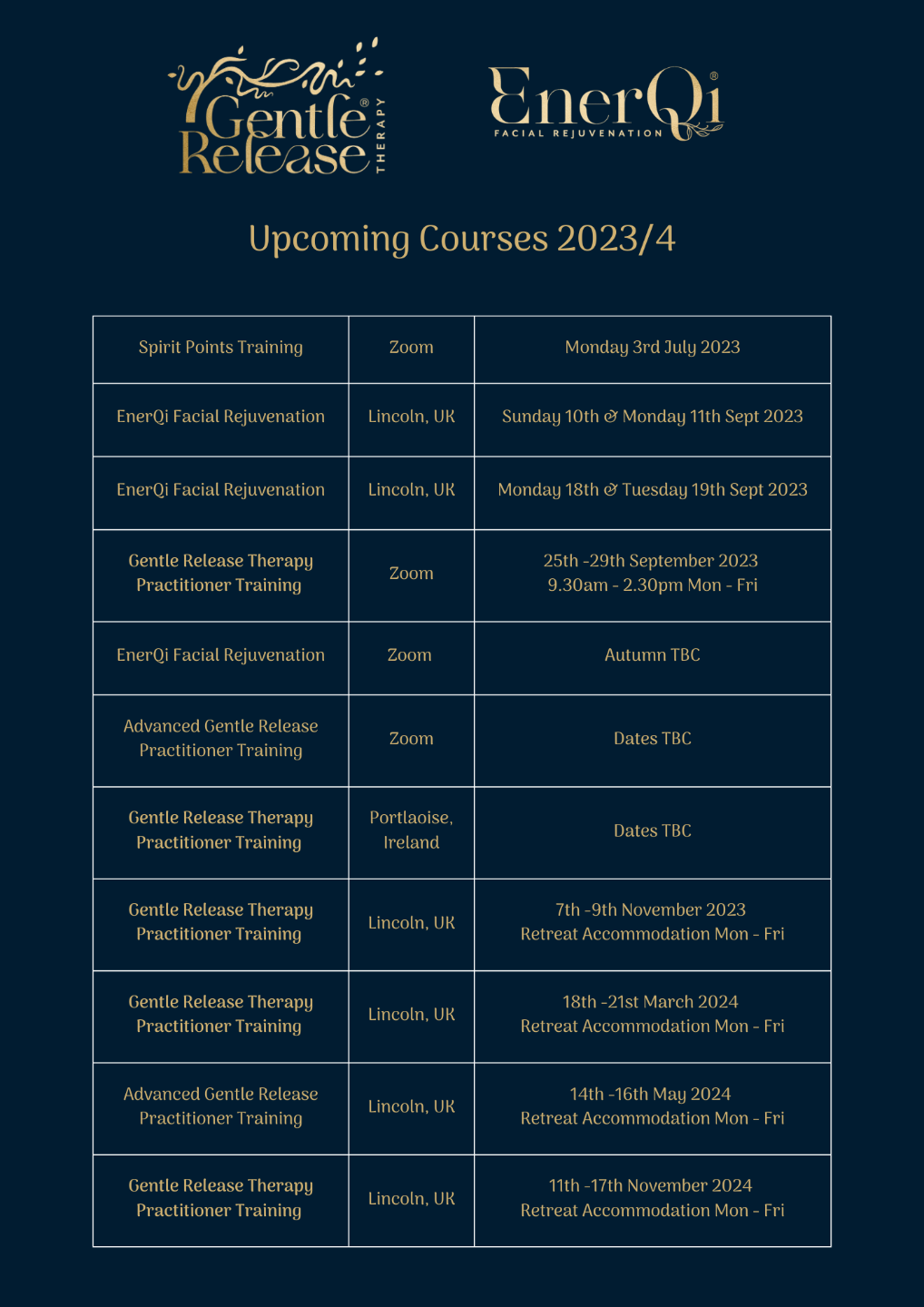 Join us at the Live on Zoom, for 3 days of intensive practical training and the chance to retreat and release at home. Spread over 5 days to fit in with school hours. The feedback for the Virtual Practitioner Retreats has been fantastic. The courses will still be small and personal with no more than 8 students per course.